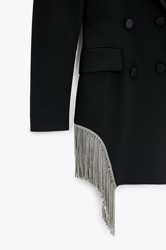 ZA Women Fashion Double-breasted Blazers Coat Vintage Long Sleeves Female Black Slim Tassel Drill Decoration Chic Outerwear